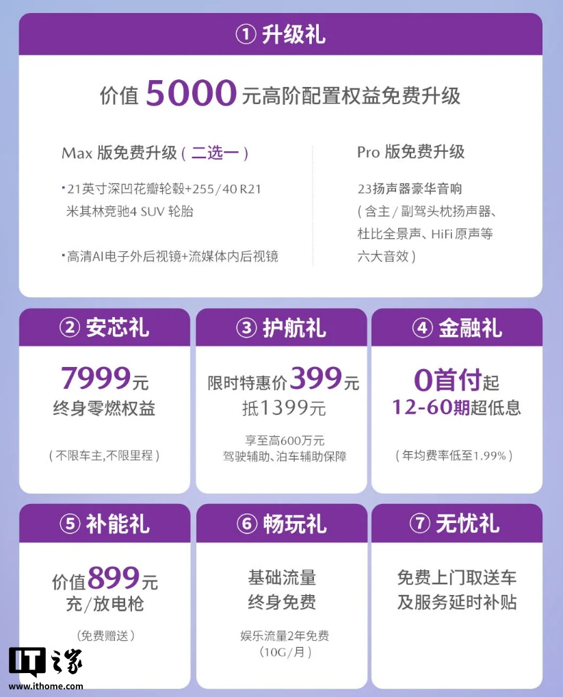 该车拥有 7 大限时购车权益,包括 Pro 和 Max 版价值 5000 元高阶配置权益免费升级。