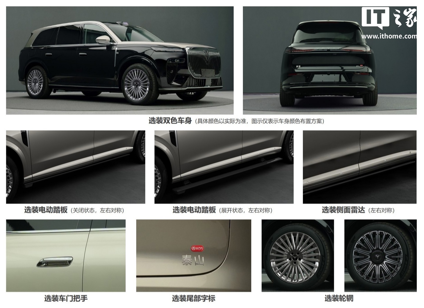 新车可选装电动踏板、侧面雷达、ADS 尾标及不同样式轮辋。动力方面,其搭载 1497ml 排量发动机,功率 110kW,配备前后双电机,峰值功率分别为 150/230kW。