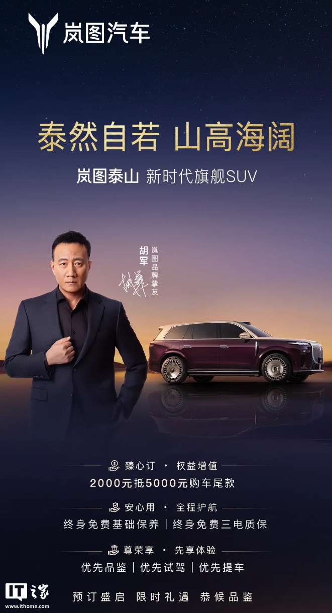 IT之家 9 月 26 日消息,岚图泰山旗舰 SUV 今晚开启预订,2000 元订金可抵 5000 元购车尾款,支持终身免费基础保养。