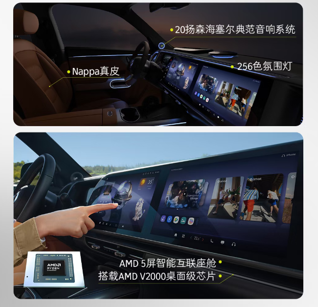 车内采用 Nappa 真皮、256 色氛围灯、20 扬森海塞尔典范音响系统、AMD 5 屏智能互联座舱,搭载 AMD V2000 桌面级芯片。