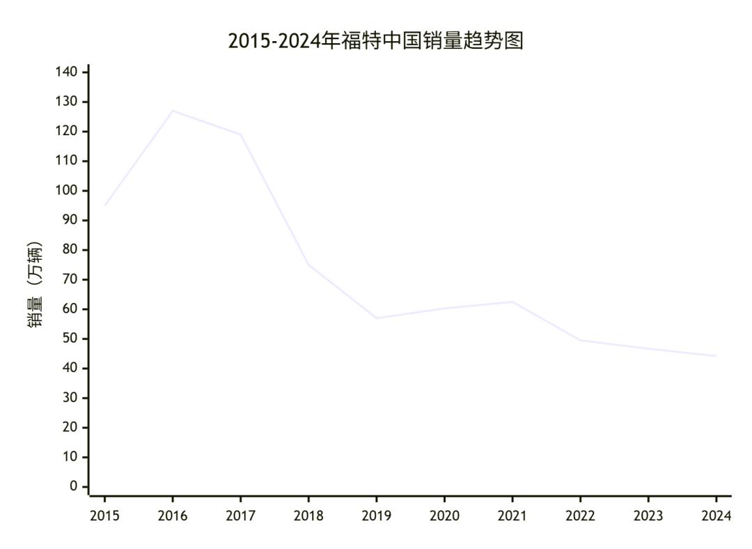 2016年,福特卖了127万辆,这成为了它的巅峰。之后,因为新品断档,点错技能树,导致竞争力下降,福特销量疯狂下滑。到2019年,只卖了56万辆,才三年时间就跌了一半多。