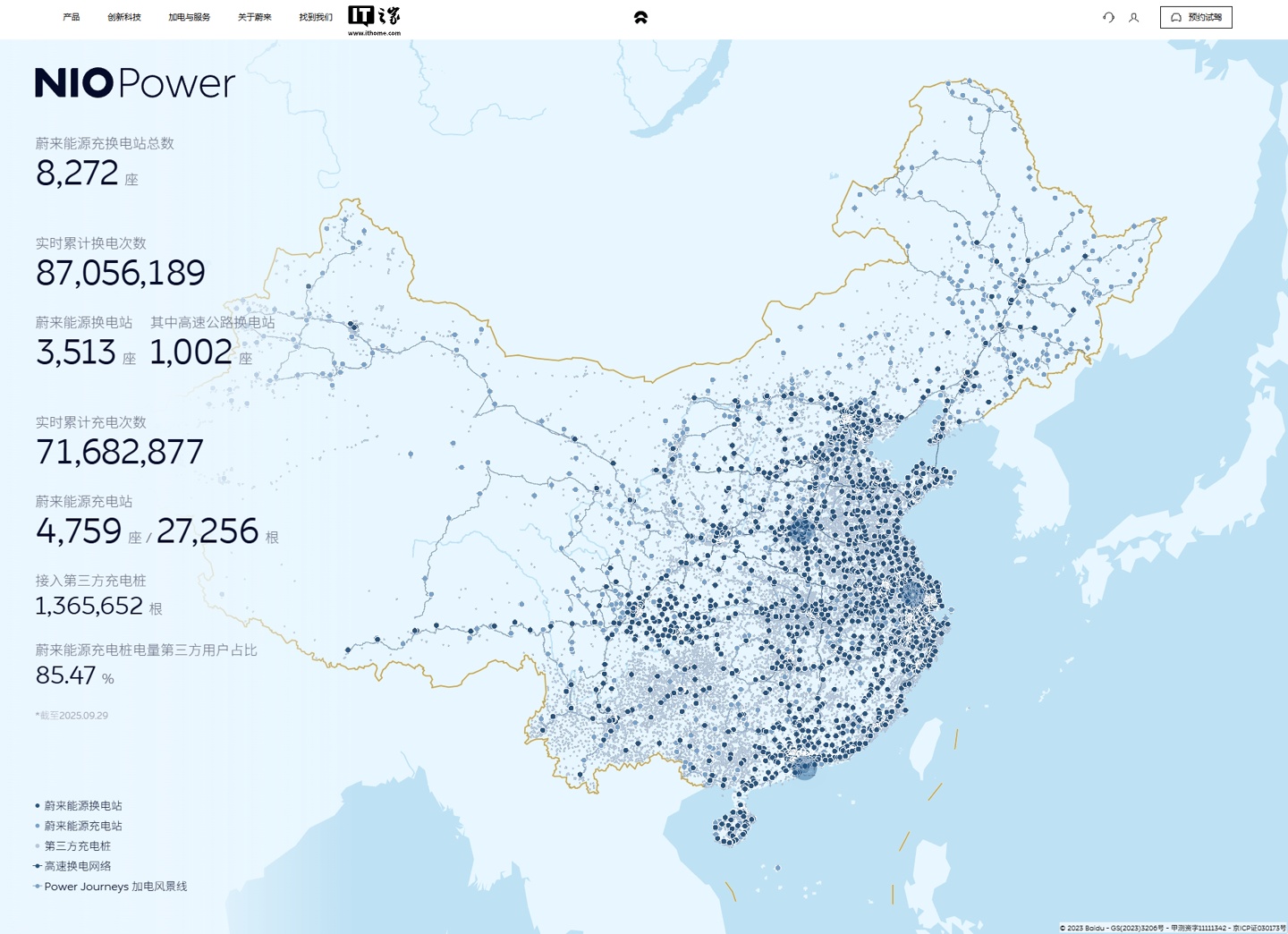 今年 9 月 20 日,蔚来宣布其第 3500 座换电站在杭州上城区富春路正式上线。截至发稿,蔚来能源充换电站总数为 8272 座,蔚来能源换电站 3513 座、高速公路换电站 1002 座、蔚来能源充电站 4759 座。