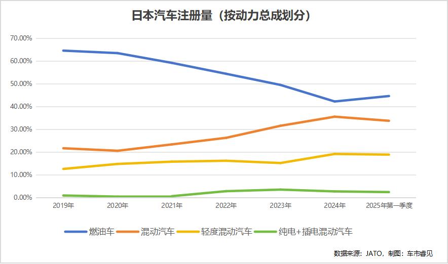日本乘用车市场正经历深刻变革,内燃机车型的份额持续萎缩。2023年,内燃机车型占乘用车总注册量的份额首次跌破50%,2024年进一步降至42.3%,尽管2025年上半年小幅回升至44.7%,但市场的主体已被电动化动力总成占据。