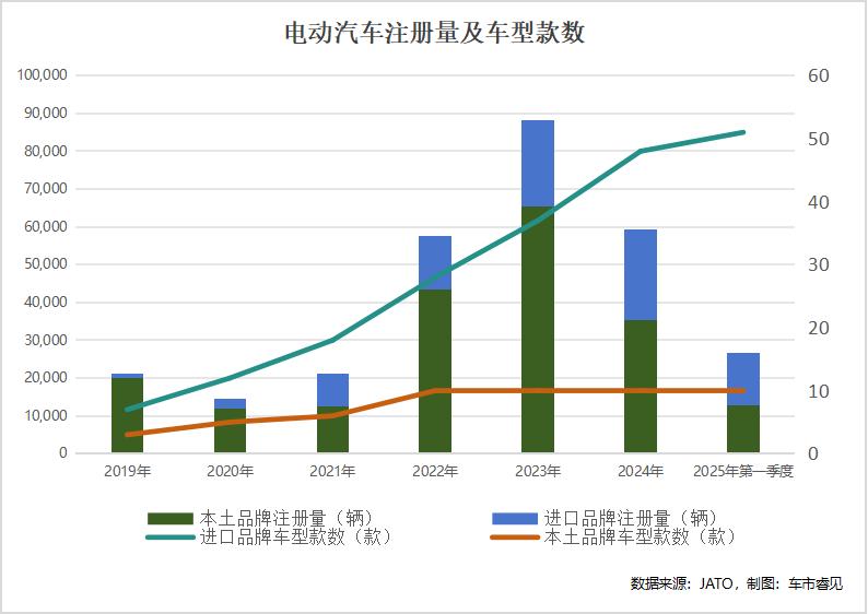 日本的纯电动汽车则进展缓慢,2019年其市场份额仅为0.5%,2023年爬升至2.2%后,2025年上半年又回落至1.3%,市场渗透速度依然有限。在售车型从2019年的10款大幅增加至2025年的61款。然而,其中仅有10款来自日本品牌,其余51款为外国品牌,凸显了进口车在日本纯电动汽车市场的的强势影响力。销量层面, 2022年日产和三菱陆续推出的轻型纯电车型,推动日本品牌纯电车型的市场份额逐步提升。轻型纯电动汽车价格实惠、尺寸紧凑,非常符合当地喜好,能够吸引当地消费者,已成为近年来采用纯电动汽车的实用起点。