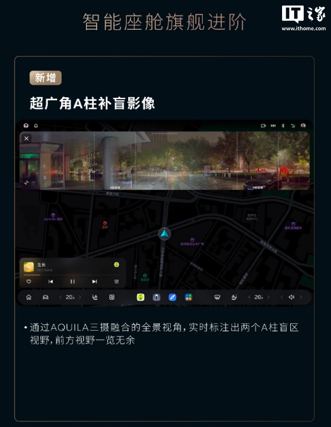 通过 AQUILA 三摄融合的全景视角,实时标注出两个 A 柱盲区视野,前方视野一览无余