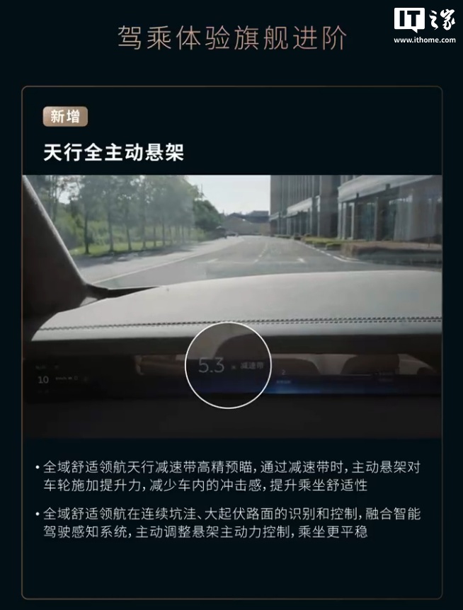 全域舒适领航天行减速带高精预瞄,通过减速带时,主动悬架对车轮施加提升力,减少车内的冲击感,提升乘坐舒适性