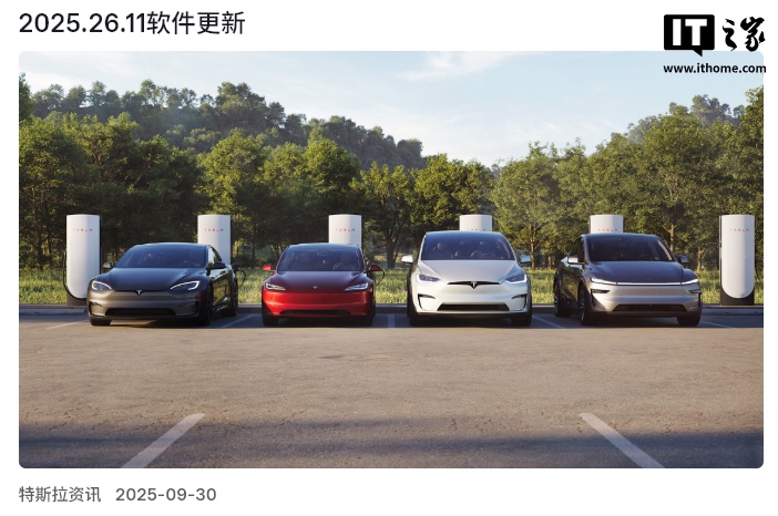 IT之家 9 月 30 日消息,特斯拉汽车今日公布了 2025.26.11 软件更新,覆盖 Model Y、Model S、Model X、Model 3 系列车型。