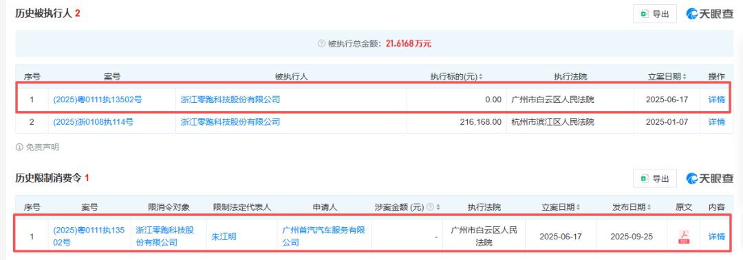 但就在同一天,广州市白云区人民发院也对零跑汽车及其法定代表人朱江明实施了限制消费措施,同时将零跑汽车列为失信被执行人。