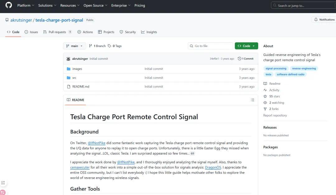 并且几年前就有老哥在 GitHub 上分享了特斯拉充电盖遥控的控制代码。真的属于是公开的秘密。。。