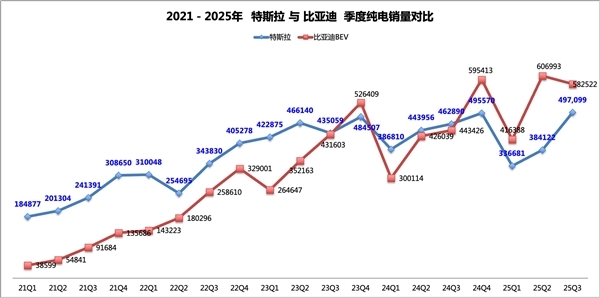 值得关注的是,这并非短期超越——2024年四季度比亚迪纯电销量第二次超特斯拉后,此后季度便再未被反超。