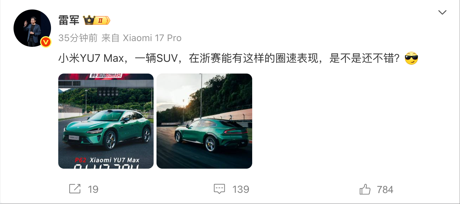 凤凰网科技讯 10月7日,小米CEO雷军公布YU7 Max浙赛圈速表现:01:43,384,暂列榜单第62位,并表示一辆SUV有这样的成绩是不是还不错?