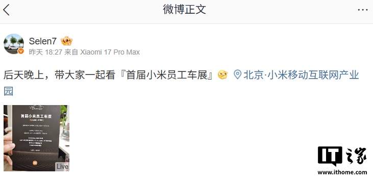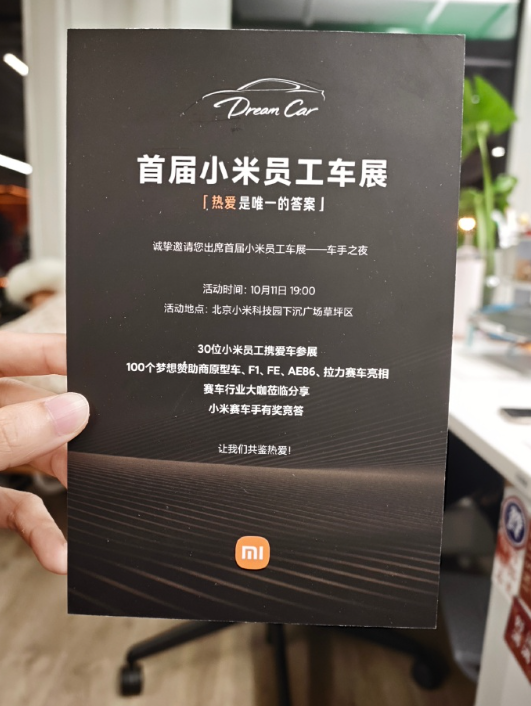 IT之家 10 月 10 日消息,小米中国区智能硬件市场负责人 @Selen7 昨日晒出邀请函,首届小米员工车展将于 10 月 11 日 19:00 举行,活动地点位于北京小米科技园下沉广场草坪区。