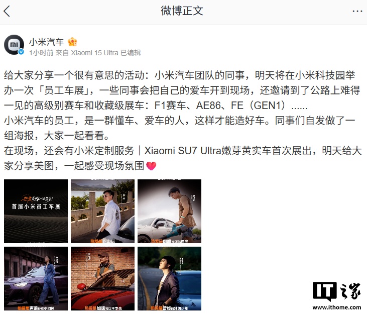 IT之家注意到,小米汽车官方今晚也公布了这一消息。小米汽车团队明天将在小米科技园举办一次「员工车展」,一些同事会把自己的爱车开到现场,还邀请到了公路上难得一见的高级别赛车和收藏级展车:F1 赛车、AE86、FE(GEN1)等。