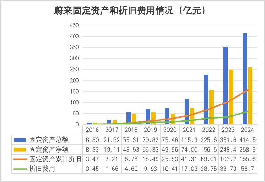 根据年报披露,蔚来固定资产总额逐年攀升,折旧费用也水涨船高,从2019年的9.93亿元攀升至2024年的58.7亿元,累计增幅高达491.14%,2019~2024年间累计折旧费用超过158亿元,占销售收入的7.6%。重资产投入产生的长期折旧费用,将持续影响利润,且折旧费用属于固定成本,如果未来蔚来销量发生波动,折旧费用将进一步侵蚀利润。