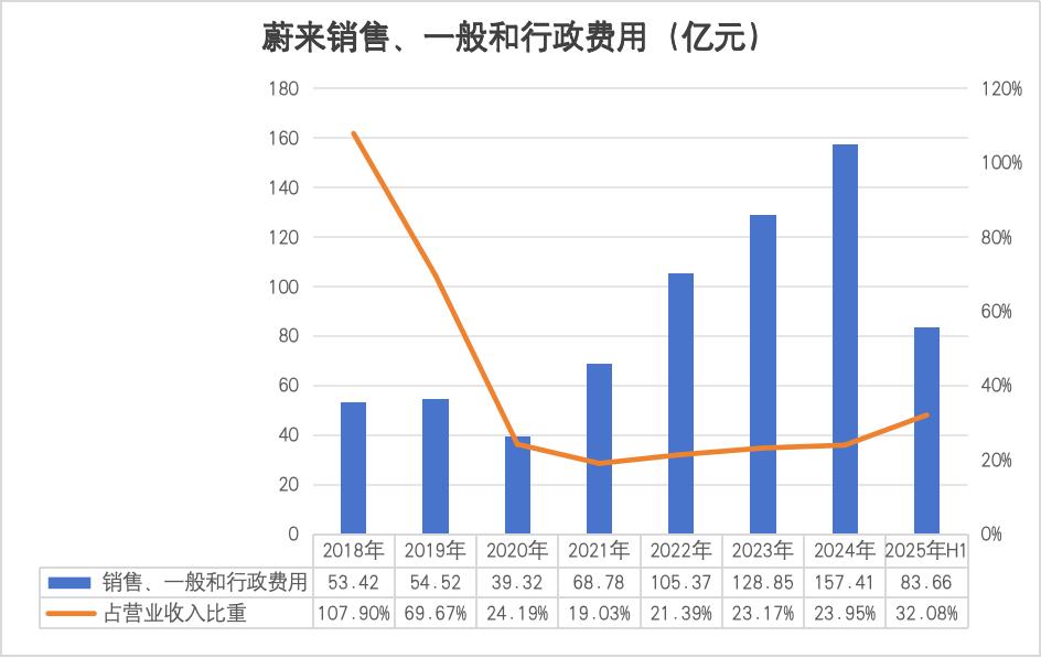 财报显示,蔚来的销售和行政费用在2018年至2024年间持续上涨,从53.42亿元攀升至157.41亿元,累计增幅高达194.66%,呈现刚性快速增长的特征。