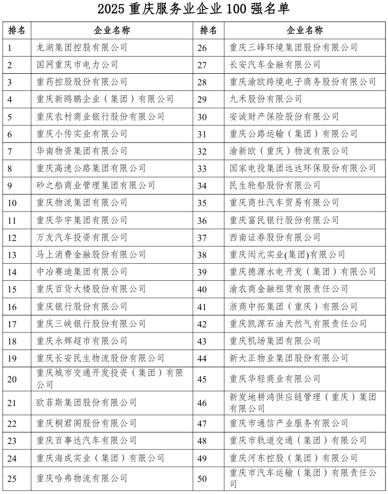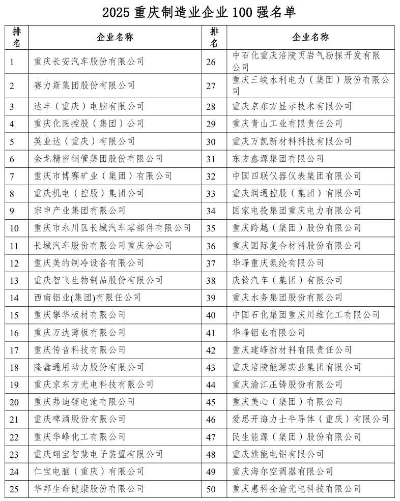 IT之家 10 月 13 日消息,重庆市企业联合会(企业家协会)于 10 月 10 日发布 2025 重庆企业 100 强分析报告及名单。会上同时发布 2025 重庆制造业企业 100 强、重庆服务业企业 100 强分析报告及名单。