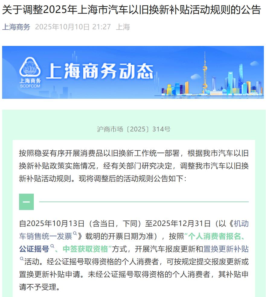 上海商务,关于调整2025年上海市汽车以旧换新补贴活动规则的公告