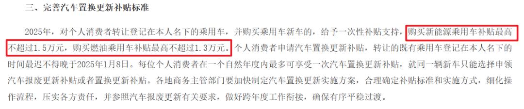 根据《商务部等8部门办公厅关于做好2025年汽车以旧换新工作的通知》的信息,走置换补贴,换新能源的最高补1.5万,换油车的最高补1.3万。