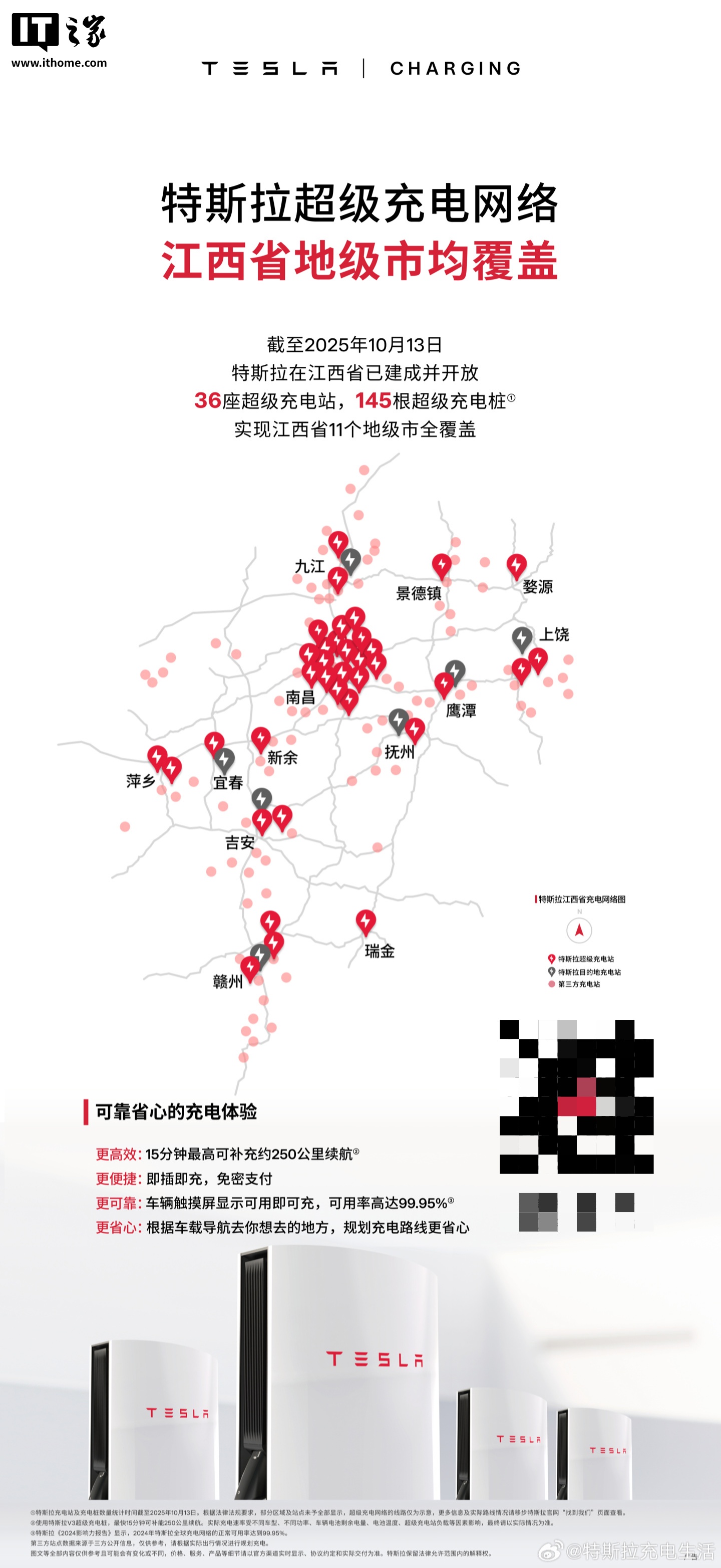 IT之家 10 月 14 日消息,特斯拉充电官方微博今日宣布,特斯拉超级充电网络已实现江西省地级市均覆盖。据介绍,截至 2025 年 10 月 13 日,特斯拉在江西省已建成并开放 36 座超级充电站、145 根超级充电桩,实现江西省 11 个地级市全覆盖。