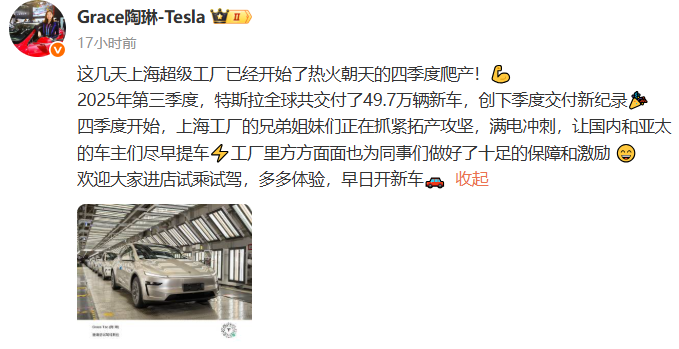 10月13日,特斯拉公司副总裁陶琳在微博宣布,特斯拉上海超级工厂已正式开启四季度爬产。这一消息标志着特斯拉在全球市场的产能布局进一步优化,同时也为即将到来的销售旺季做好了准备。