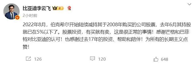 对此消息,9月22日, 比亚迪集团品牌及公关处总经理李云飞在盘前回应称:“2022年8月,伯克希尔开始陆续减持其于2008年购买的公司股票,去年6月其持股就已在5%以下了。股票投资,有买就有卖,这是很正常的事情!感谢芒格和巴菲特对比亚迪的认可!也感谢过去17年的投资、帮助和陪伴!为所有的长期主义点赞! ”
