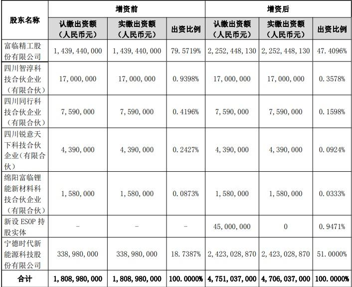 今年3月,富临精工曾发布公告称,江西升华拟以增资扩股的方式引入战略投资者宁德时代,后者拟以4亿元认购江西升华新增注册资本3.39亿元,并取得江西升华本次交易交割完成后基于完全摊薄基础上18.7387%的股权。
