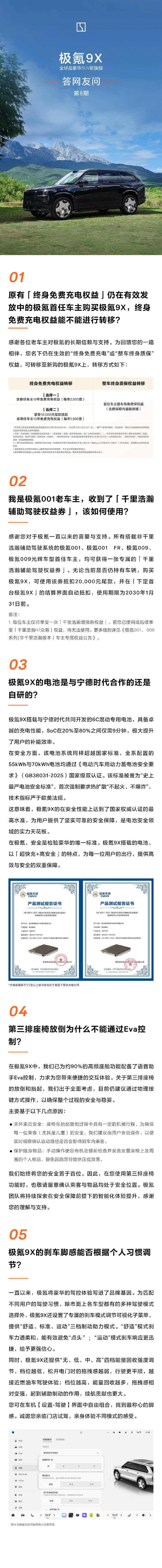 凤凰网科技讯 10月16日,新一期的极氪9X答网友问中明确,极氪首任车主名下仍在生效的“终身免费充电”或“整车终身质保”权益,可转移至新购的极氪9X上。