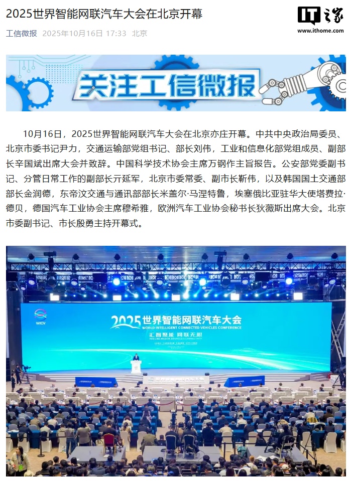 IT之家 10 月 16 日消息,2025 世界智能网联汽车大会今日在北京开幕,工业和信息化部党组成员、副部长辛国斌出席大会并致辞。