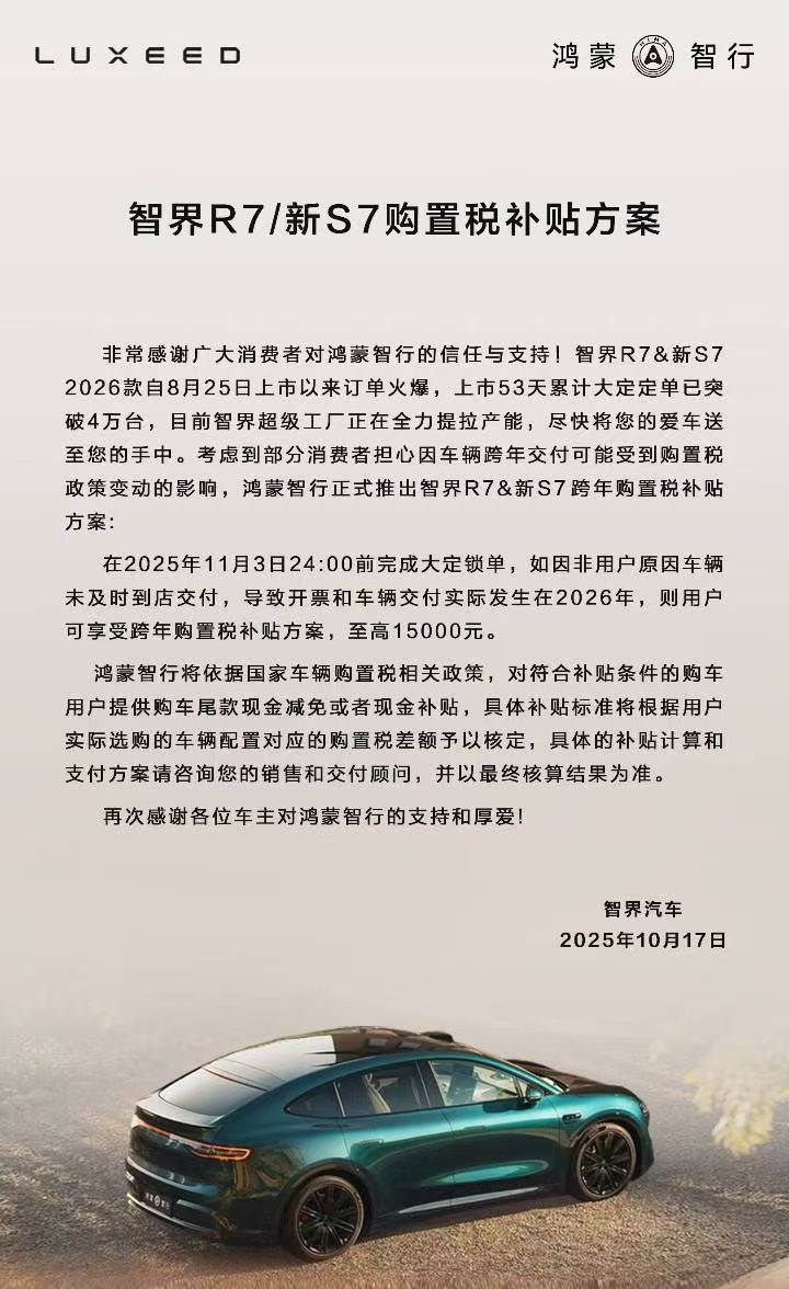 IT之家 10 月 18 日消息,昨天晚上,鸿蒙智行官方公布了智界 R7 / 新 S7 的购置税补贴方案:11 月 3 日 24 时之前完成大定锁单,如因非用户原因车辆未及时到店交付,导致开票和车辆交付实际发生在 2026 年,则用户可享受跨年购置税补贴方案,至高 15000 元。