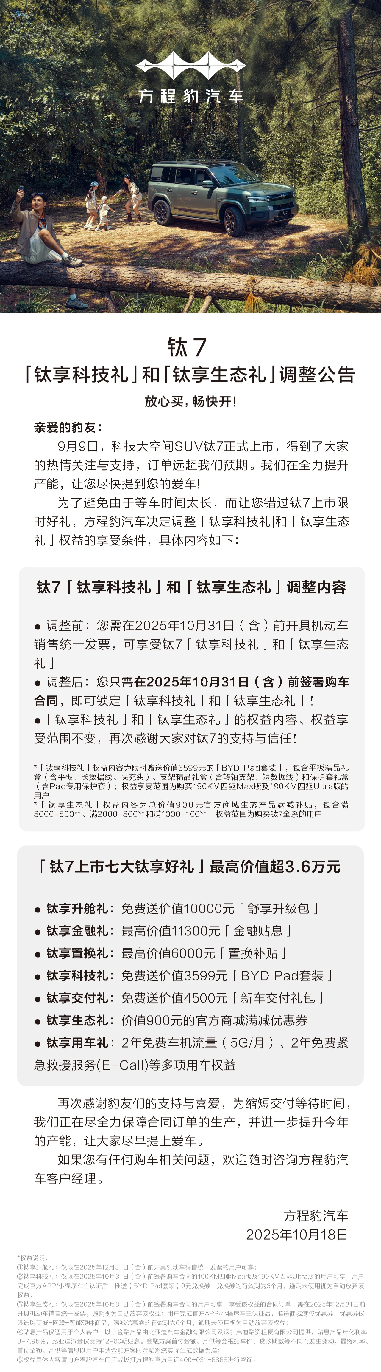 调整前:需在 2025 年 10 月 31 日 (含) 前开具机动车销售统一发票,可享受钛 7「钛享科技礼」和「钛享生态礼」。