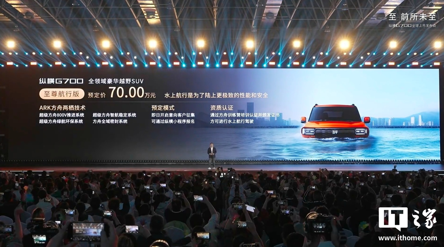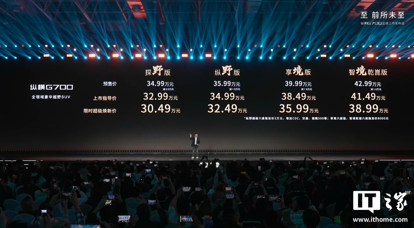 IT之家 10 月 19 日消息,奇瑞旗下捷途纵横 G700 车型今晚上市,共提供 4 个版本,官方指导价 32.99 万-41.49 万元,限时超级焕新价 30.49 万-38.99 万元,顶配车型配备华为乾崑智驾 ADS 4。此外,新车还推出了至尊航行版,指导价 70 万元。