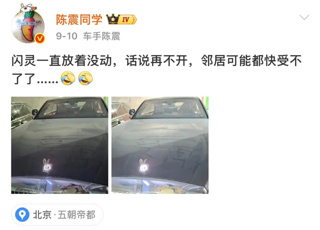 笔者发现,陈震于5月末将这台劳斯莱斯闪灵提车到手,而后在9月发布了一条博文,陈震表示,闪灵一直放着没开。