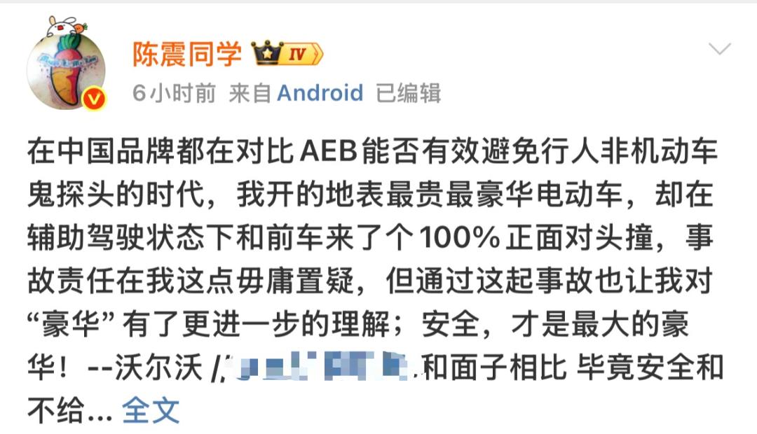 今日,车评人陈震针对车祸事件再进行了回应。
