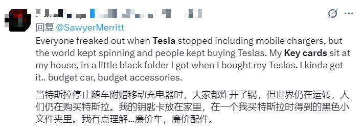 亦有网友表示,可以理解并接受减配钥匙卡,当年特斯拉取消标配移动充电器时,也是争议不断,但依然不影响特斯拉畅销: