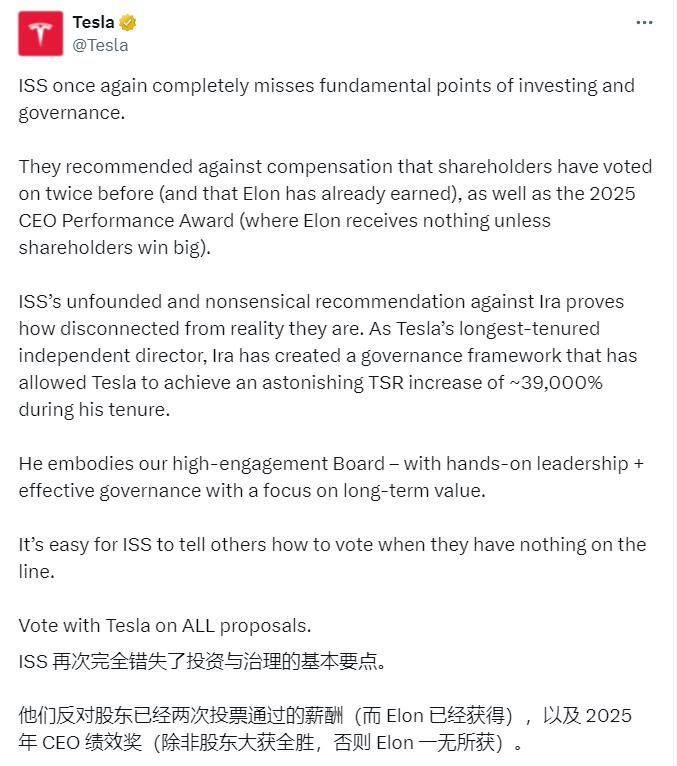 特斯拉官方账号还发文反驳了ISS,认为后者再次完全忽视了投资和治理的基本要点,并呼吁大家,支持特斯拉就所有提案投票。