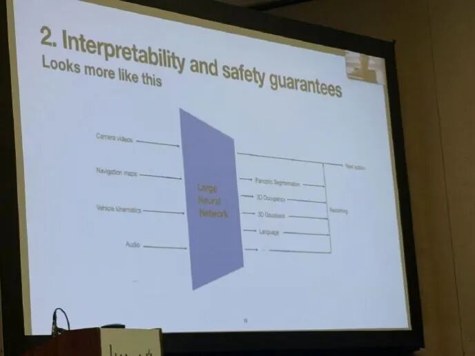 从模糊的图像中可以看到,这页PPT的标题是《可解释性和安全性保证》,都是目前自动驾驶的重要议题。