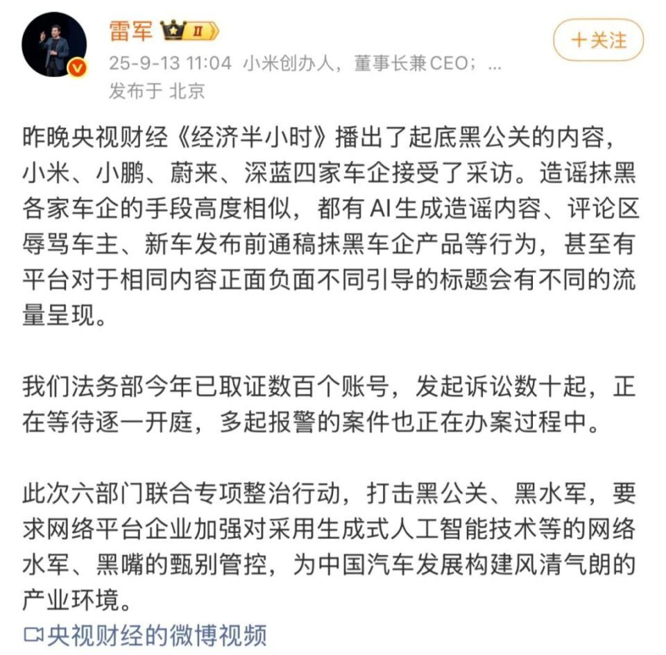 实际上,小米和雷军的反黑公关倡议并非毫无行业基础。9月12日,央视财经就曾播出专题报道,揭露新能源汽车行业黑公关产业链的运作模式:策划方下单后,内容工厂通过AI批量生成虚假信息,再经账号矩阵分发扩散,而 “小米汽车碰撞后车门打不开” 的虚假视频,早在2024年11月就已被警方查处,却仍在网络上反复传播。