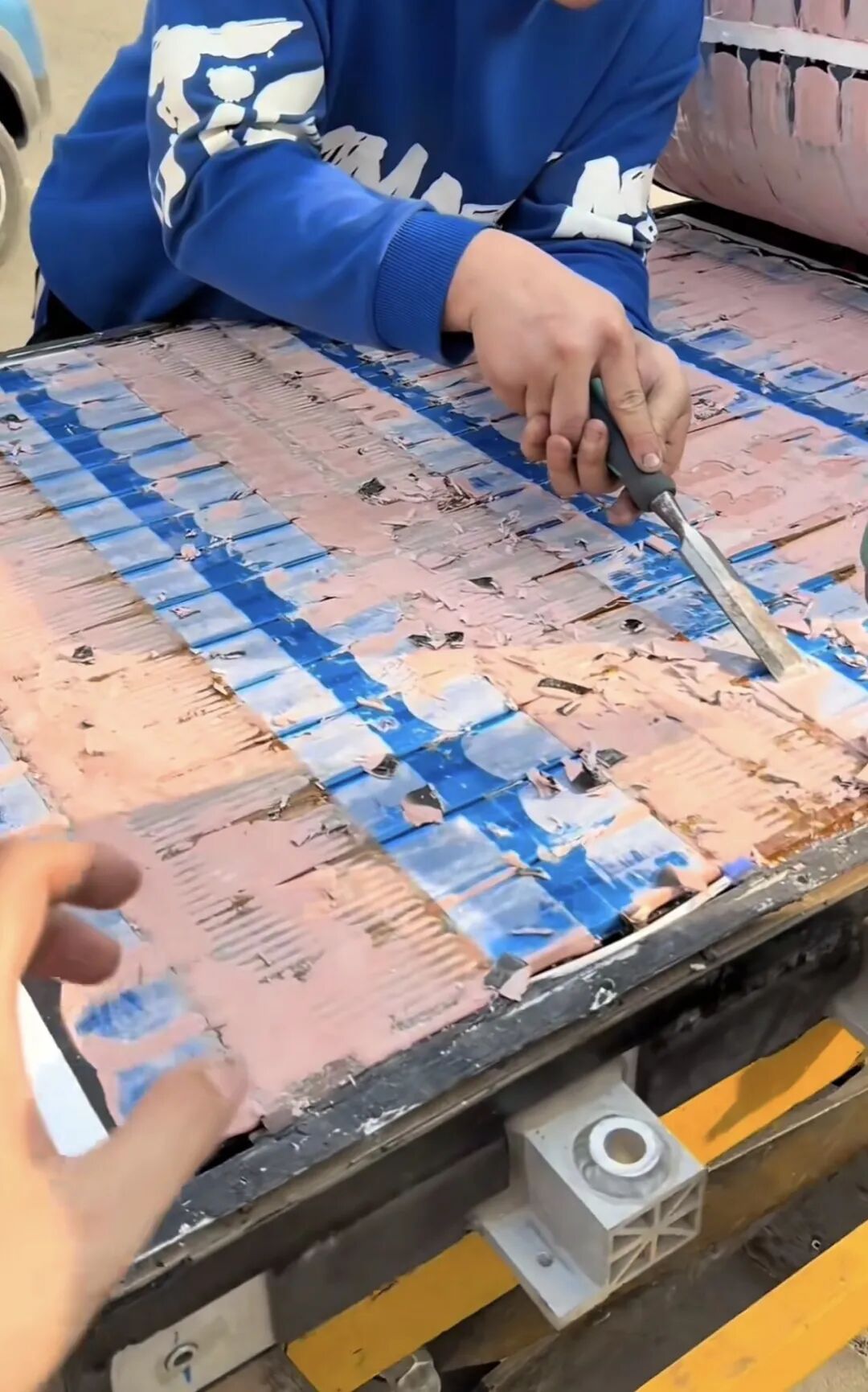 图/某车厂工作人员为刀片电池清理胶,来源/互联网 新能源观截图