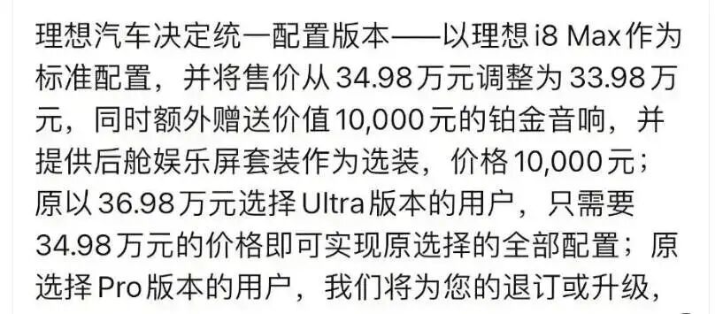 结果上市不到一周,理想紧急调整方案:取消Pro与Ultra版,统一以Max版为标准配置,售价降至33.98万元并赠送价值1万元铂金音响,同时提供后舱娱乐屏选装。