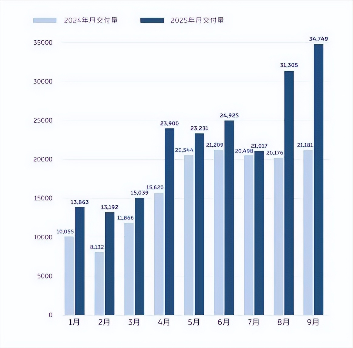 先看销量。今年9月,蔚来交付新车34,749台,同比增长64%。其中,蔚来品牌交付新车13,728台;乐道品牌交付新车15,246台;firefly萤火虫品牌交付新车5,775台。第三季度,蔚来累计交付新车8.7万辆,刷新了季度交付纪录。