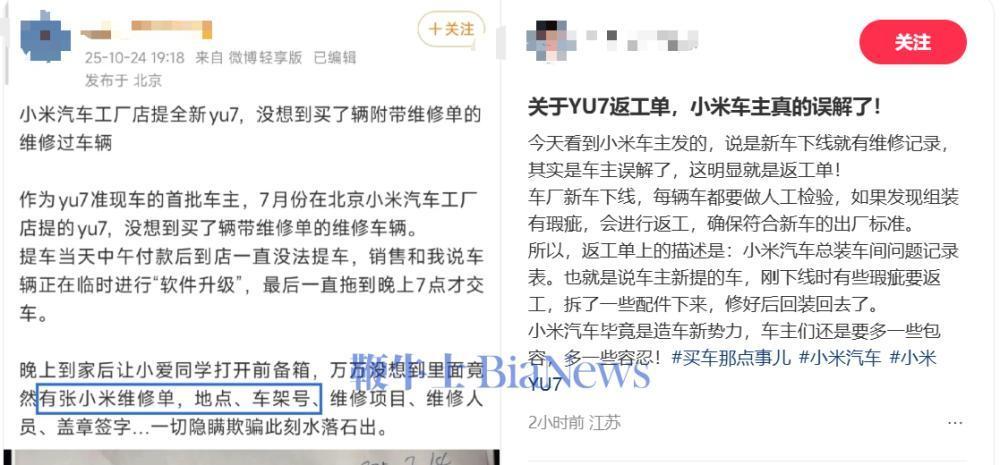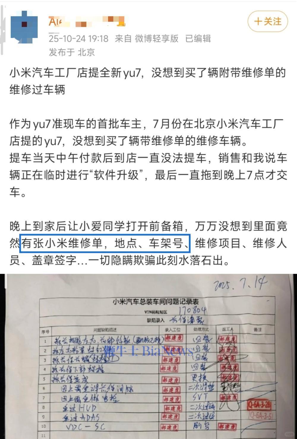 近日,有小米车主称,在小米汽车工厂店提的全新YU7,却是维修过的车辆。