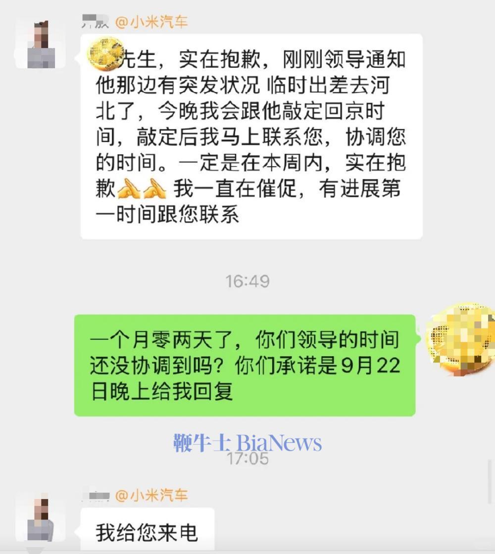 面对车主质疑,小米店员回应称,因突发状况需要出差,敲定回程时间后,会在周内联系车主。