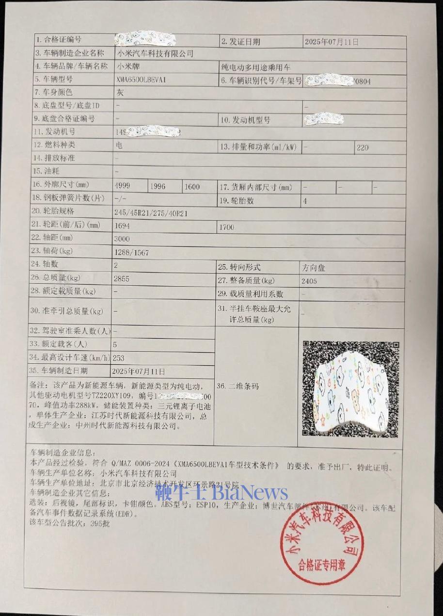 车主还晒出了这辆小米YU7的合格证。