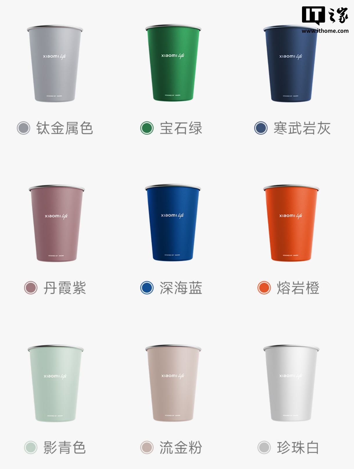 Xiaomi Life 不锈钢直饮杯 9 色套装采用小米 YU7 车身同款配色,350mL 容量、304 不锈钢材质。