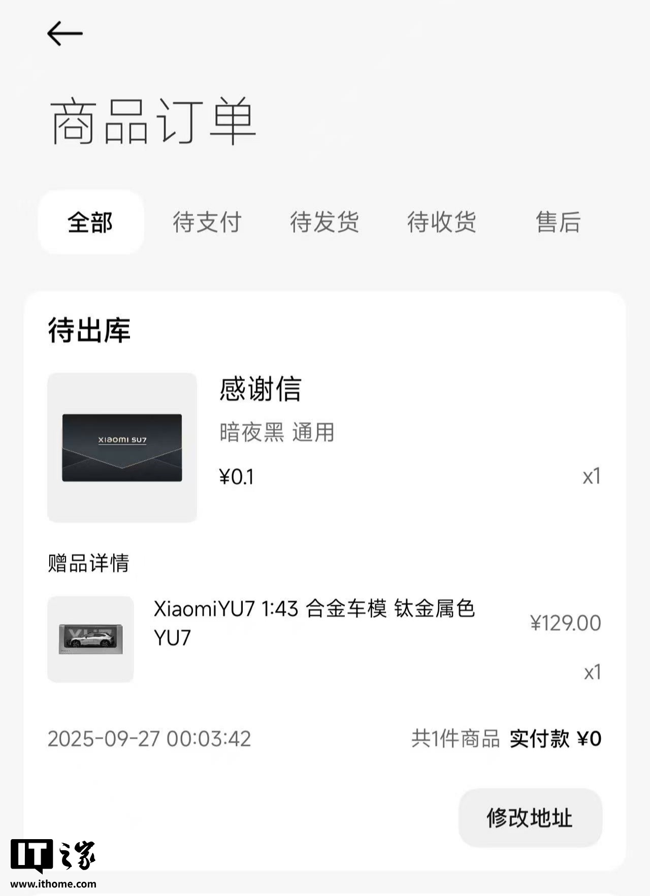 IT之家 10 月 27 日消息,小米汽车于 9 月 20 日起面向部分锁单等待的 YU7 车主推出“Xiaomi YU7 锁单等待用户关怀活动”,锁单到交付实际等待周期超过 3 个月,可能会不定期地收到小米汽车准备的小礼品。