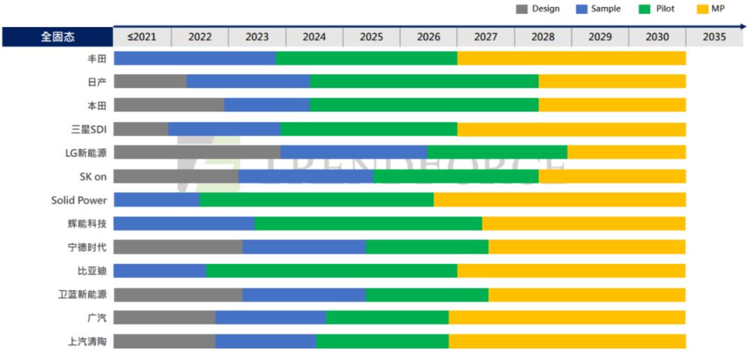 目前,宁德时代、国轩高科、丰田、三星SDI等全球领先制造商的全固态电池,都已经进入到试制阶段,并给出了各自的量产时间表。