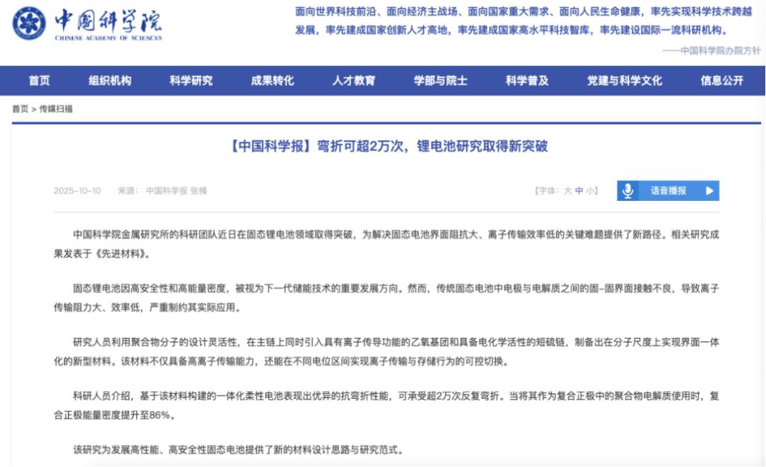 其次,固态电池材料也有了新的突破。中国科学院金属研究所的科研团队,利用聚合物分子的设计灵活性,制备出在分子尺度上实现界面一体化的新型材料,能够抗拉耐拽;