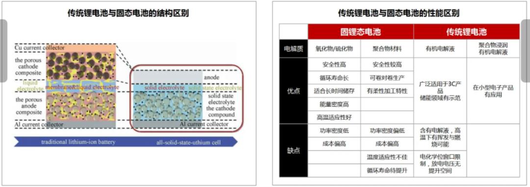 与沿用成熟体系的液态电池不同,固态电池在材料体系与制造工艺上是一场全方位的革新。因此,固态电池相较于液态电池,也有更多的优点:不用担心热失控,相对安全;能量密度更高,续航更长;能够适应极端环境,充电更快等。
