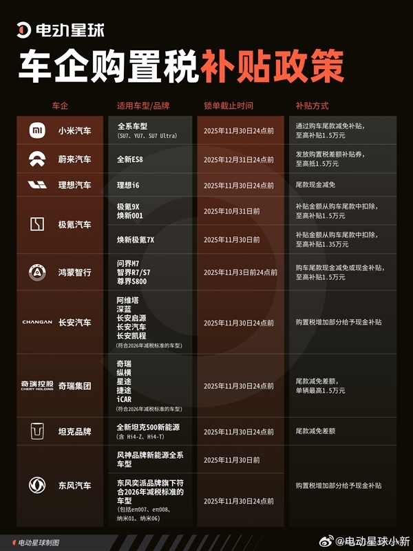 具体来看,小米汽车、奇瑞、长安汽车,针对旗下全系符合2026年减税标准的车型,均给出了购置税减免的补贴政策,最高补贴金额为1.5万元;且均要求锁单截止日期在11月30日24点前。
