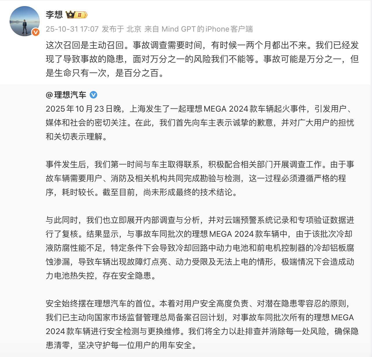 2025年10月23日晚,上海发生了一起理想MEGA 2024款车辆起火事件。根据理想汽车官方公告,通过展开内部调查与分析,并对云端预警系统记录和专项验证数据进行了复核。结果显示,与事故车同批次的理想MEGA 2024款车辆中,由于该批次冷却液防腐性能不足,特定条件下会导致冷却回路中动力电池和前电机控制器的冷却铝板腐蚀渗漏,导致车辆出现故障灯点亮、动力受限及无法上电的情形,极端情况下会造成动力电池热失控,存在安全隐患。